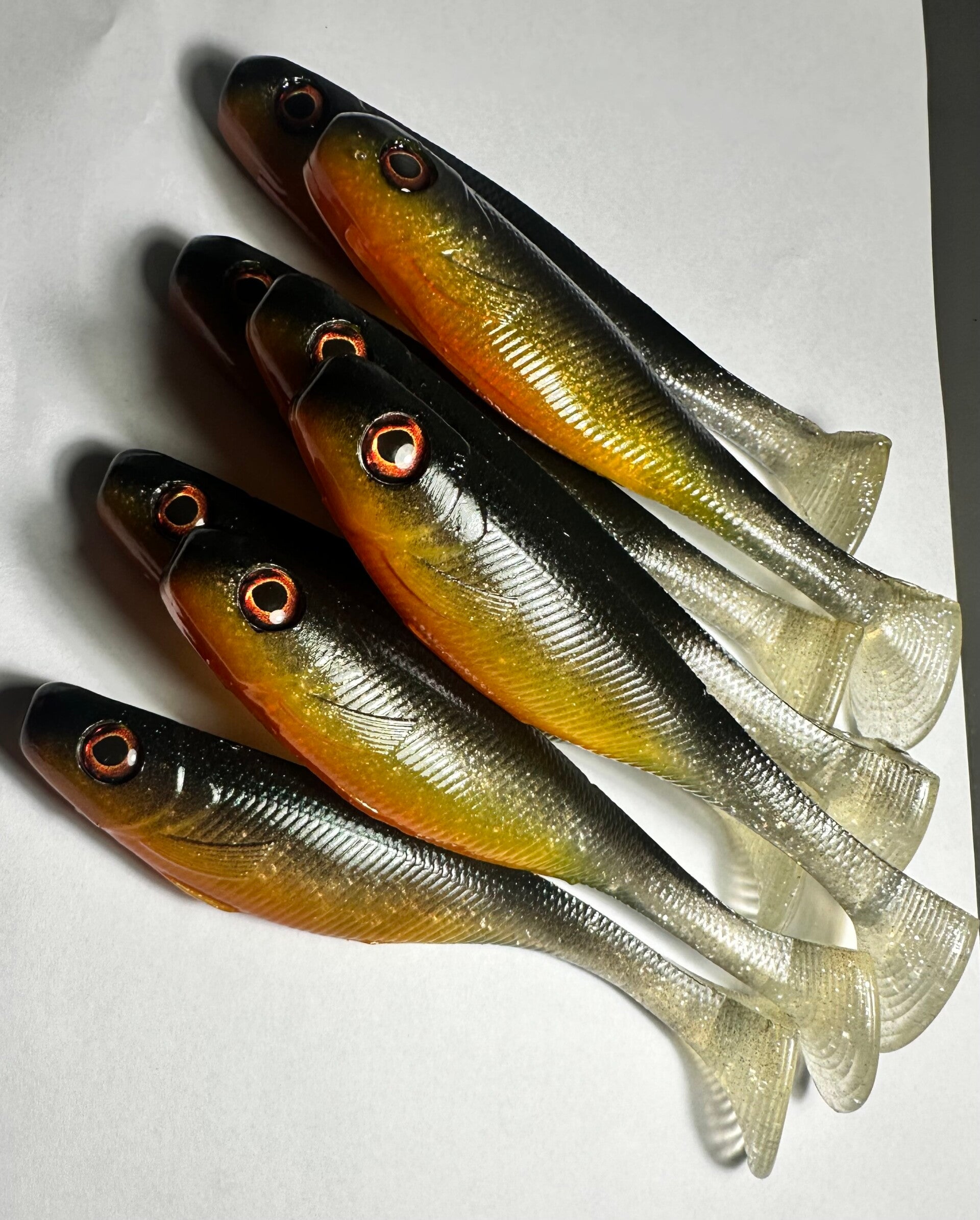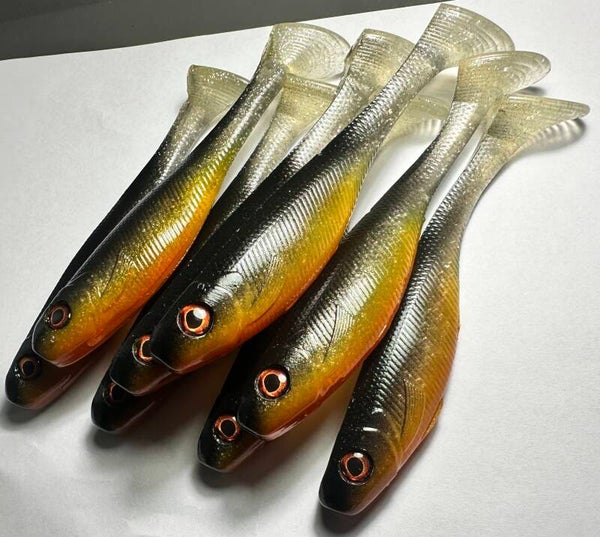 Burnt Shiner on klassinen ja äärimmäisen tehokas paddle tail -jigi, jonka väritys yhdistää luonnollisen saaliskalan ja ärsyttävän kontrastin. Tumma selkä, metallinhohtoinen kylki ja voimakas oranssinkeltainen vatsa tekevät tästä väristä todellisen haukimagneetin erityisesti sameassa vedessä ja hämärissä olosuhteissa.